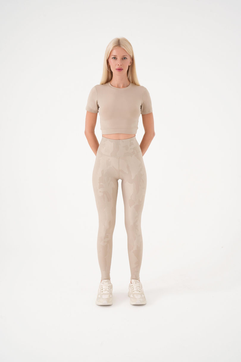 Yüksek Bel Kamuflaj Desenli Spor Tayt – Bej