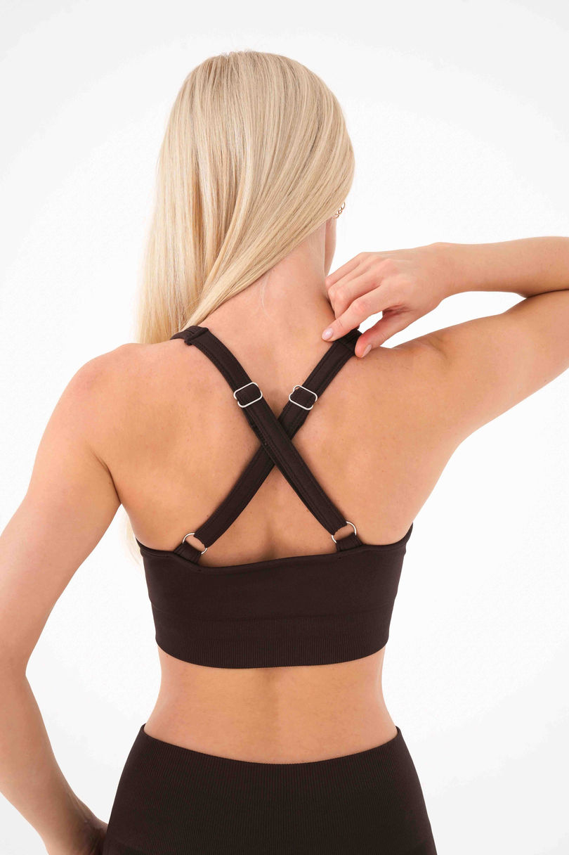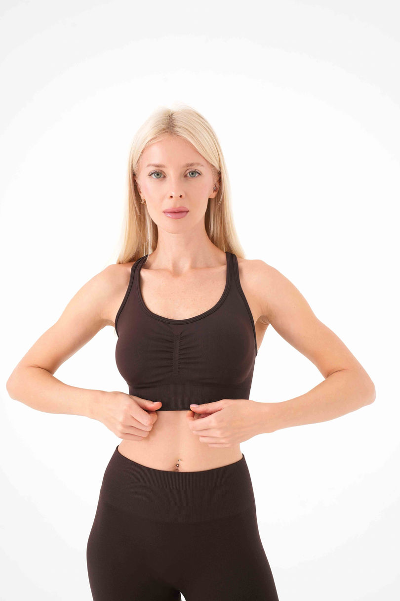 Zarif kahverengi tonu ve push-up etkili seamless yapısı ile hem destek hem şıklığı bir arada sunar. Ön büzgü detayı göğüs formunu doğal şekilde toparlayarak daha dolgun bir görünüm sağlar. Sırt kısmındaki çapraz ve ayarlanabilir askılar, antrenman sırasında ekstra destek ve kişisel uyum sunar.